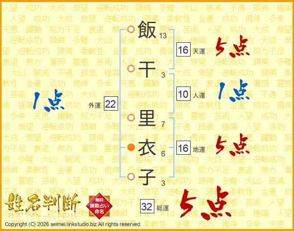 飯(13画)干(3画) 里(7画)衣(6画)子(3画)