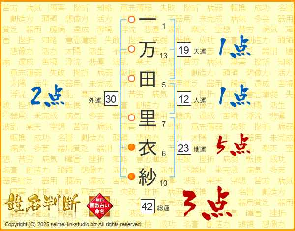 一(1画)万(13画)田(5画) 里(7画)衣(6画)紗(10画)