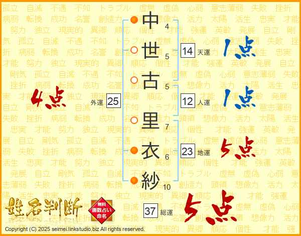 中世古里衣紗さんの総運は37画の5点!