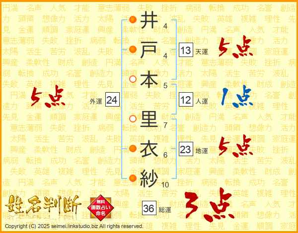 井(4画)戸(4画)本(5画) 里(7画)衣(6画)紗(10画)