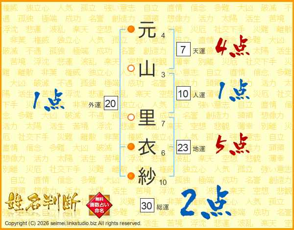 元(4画)山(3画) 里(7画)衣(6画)紗(10画)