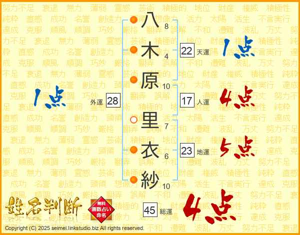 八(8画)木(4画)原(10画) 里(7画)衣(6画)紗(10画)