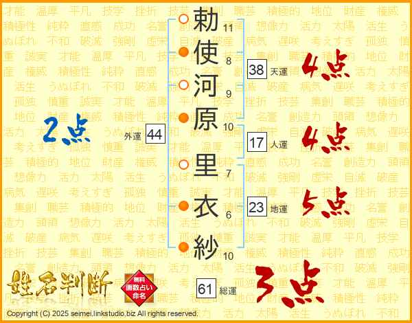 勅(11画)使(8画)河(9画)原(10画) 里(7画)衣(6画)紗(10画)