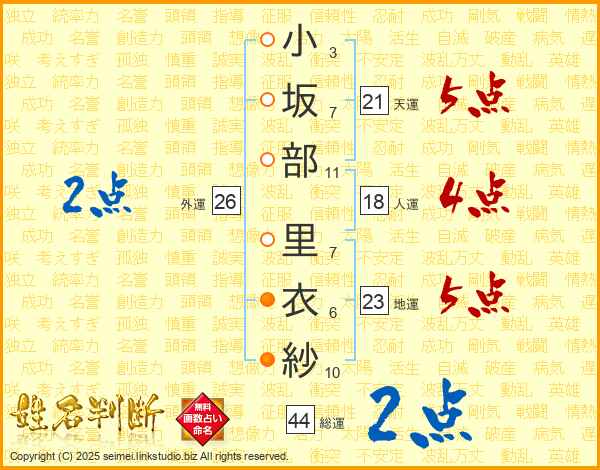 小(3画)坂(7画)部(11画) 里(7画)衣(6画)紗(10画)