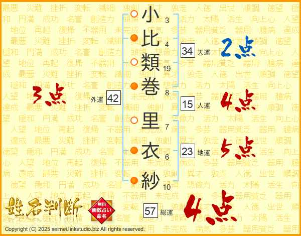 小(3画)比(4画)類(19画)巻(8画) 里(7画)衣(6画)紗(10画)