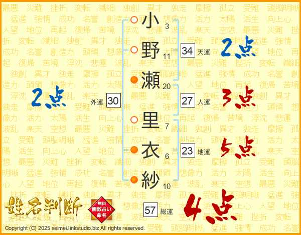 小(3画)野(11画)瀬(20画) 里(7画)衣(6画)紗(10画)