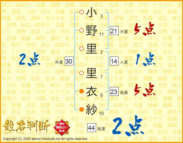 小(3画)野(11画)里(7画) 里(7画)衣(6画)紗(10画)