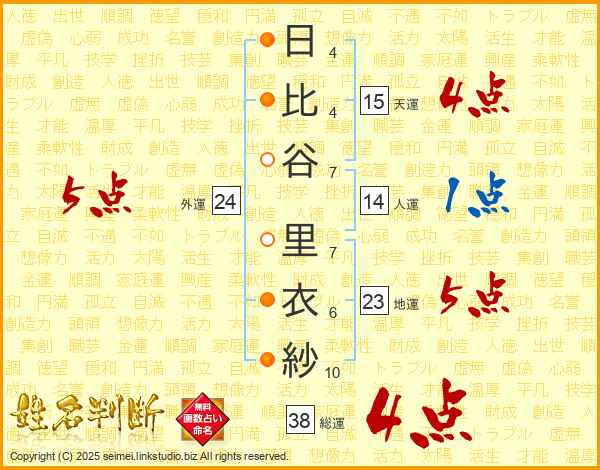 日(4画)比(4画)谷(7画) 里(7画)衣(6画)紗(10画)