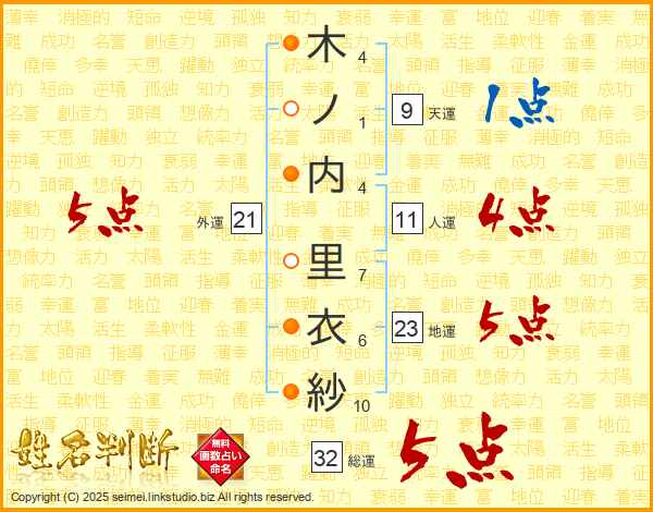 木(4画)ノ(1画)内(4画) 里(7画)衣(6画)紗(10画)