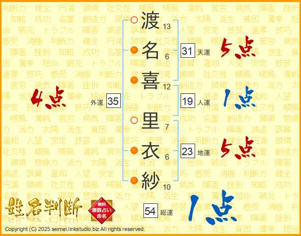 渡(13画)名(6画)喜(12画) 里(7画)衣(6画)紗(10画)