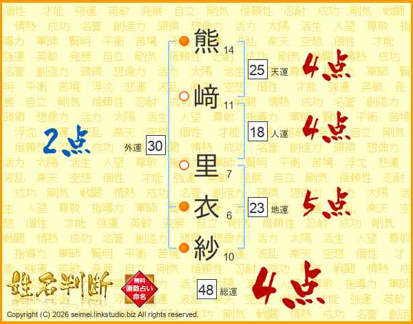 熊(14画)﨑(11画) 里(7画)衣(6画)紗(10画)