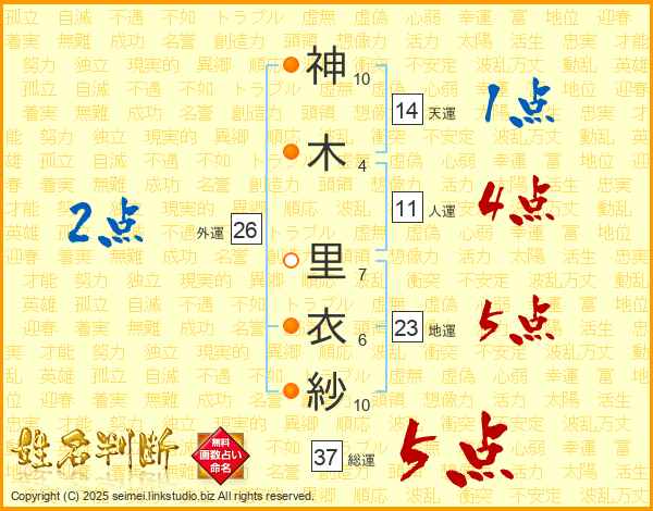 神(10画)木(4画) 里(7画)衣(6画)紗(10画)