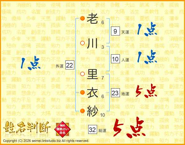 老(6画)川(3画) 里(7画)衣(6画)紗(10画)