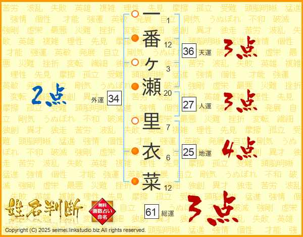 一番ヶ瀬里衣菜さんの総運は61画の3点!