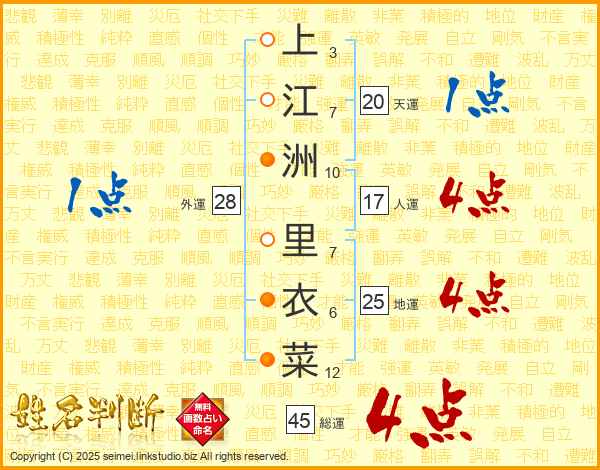 生活面を象徴する運勢です。外部から受ける影響力を表し、結婚運、家庭運や職場、環境への順応性を表します。総運から人運を引いた画数。姓や名が1文字の場合を除く。