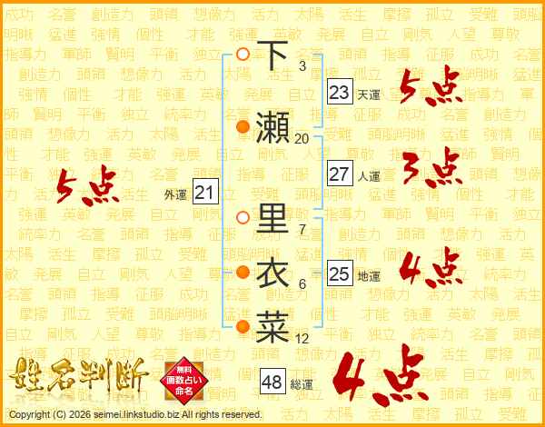 下(3画)瀬(20画) 里(7画)衣(6画)菜(12画)