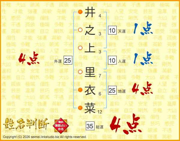 井(4画)之(3画)上(3画) 里(7画)衣(6画)菜(12画)