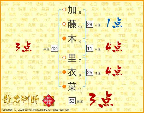 加藤木里衣菜さんの総運は53画の3点!