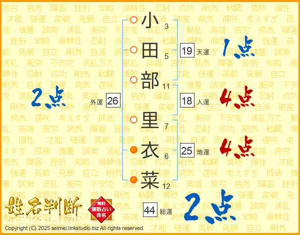 小(3画)田(5画)部(11画) 里(7画)衣(6画)菜(12画)