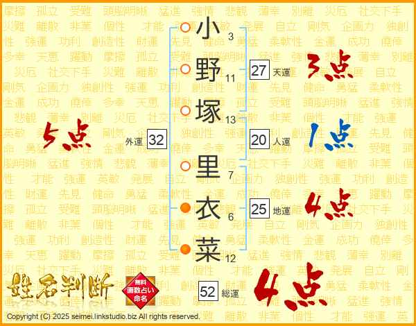 小(3画)野(11画)塚(13画) 里(7画)衣(6画)菜(12画)