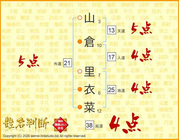 山(3画)倉(10画) 里(7画)衣(6画)菜(12画)