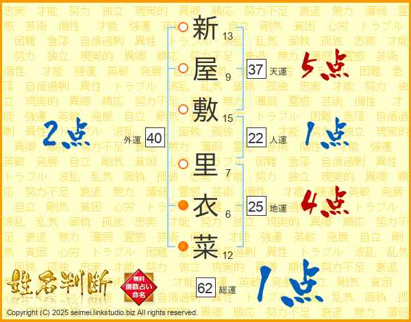 新(13画)屋(9画)敷(15画) 里(7画)衣(6画)菜(12画)