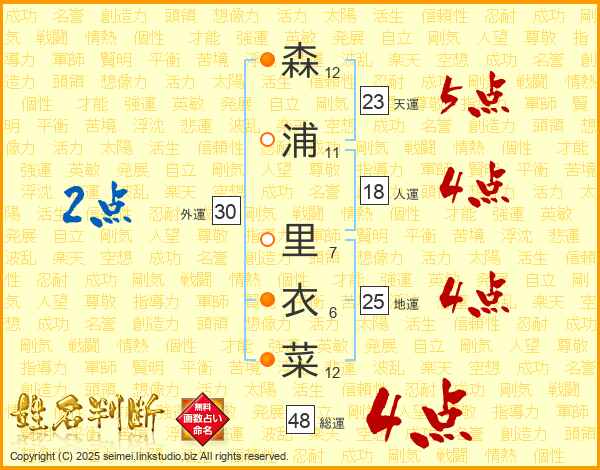 森(12画)浦(11画) 里(7画)衣(6画)菜(12画)