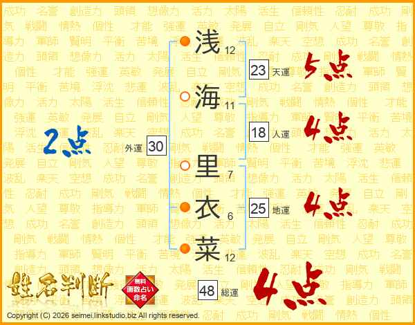 浅海里衣菜さんの総運は48画の4点!