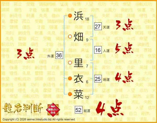 浜畑里衣菜さんの総運は52画の4点!