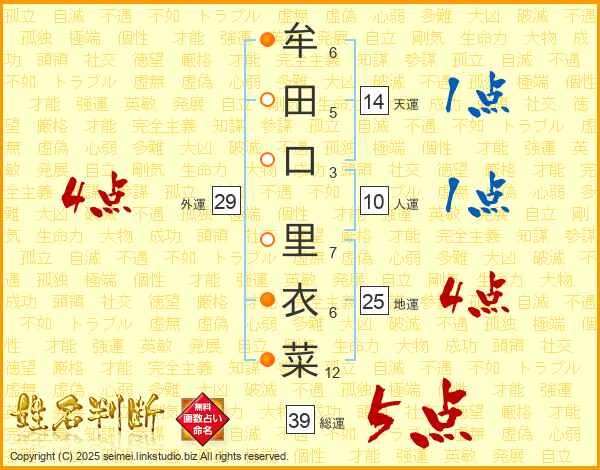 牟(6画)田(5画)口(3画) 里(7画)衣(6画)菜(12画)