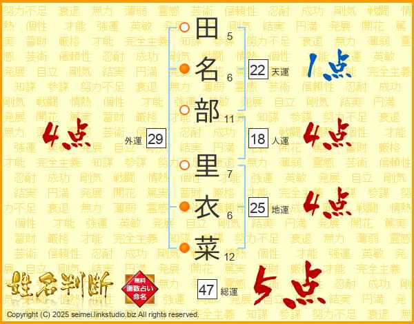 田(5画)名(6画)部(11画) 里(7画)衣(6画)菜(12画)