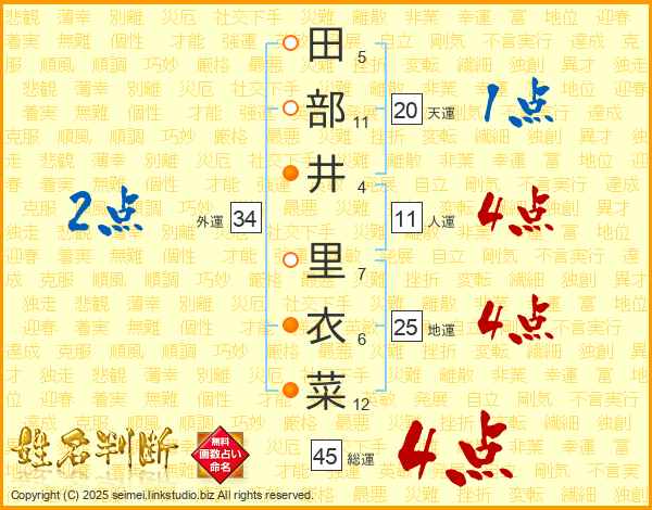 田(5画)部(11画)井(4画) 里(7画)衣(6画)菜(12画)