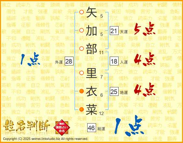 矢(5画)加(5画)部(11画) 里(7画)衣(6画)菜(12画)