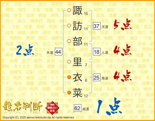 諏(15画)訪(11画)部(11画) 里(7画)衣(6画)菜(12画)