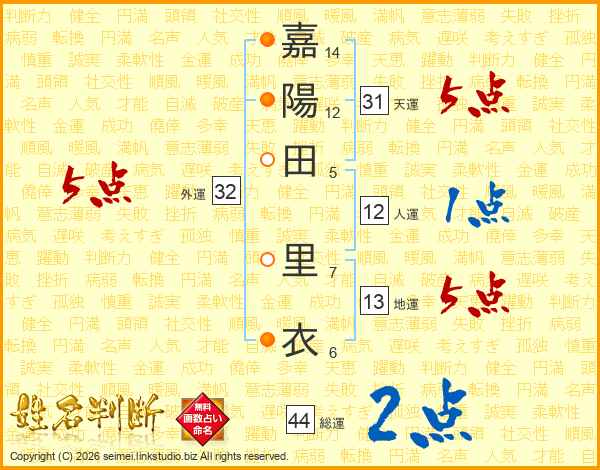 嘉(14画)陽(12画)田(5画) 里(7画)衣(6画)