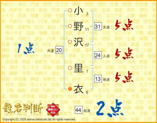 小野沢里衣さんの総運は44画の2点!