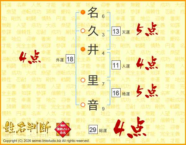 名久井里音さんの総運は29画の4点!
