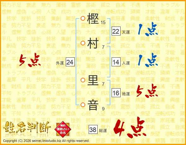 生活面を象徴する運勢です。外部から受ける影響力を表し、結婚運、家庭運や職場、環境への順応性を表します。総運から人運を引いた画数。姓や名が1文字の場合を除く。