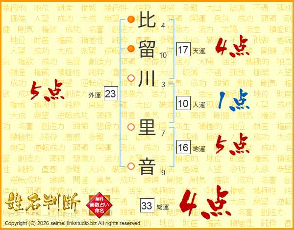 比留川里音さんの総運は33画の4点!
