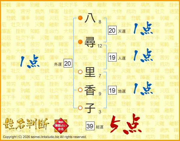 八(8画)尋(12画) 里(7画)香(9画)子(3画)