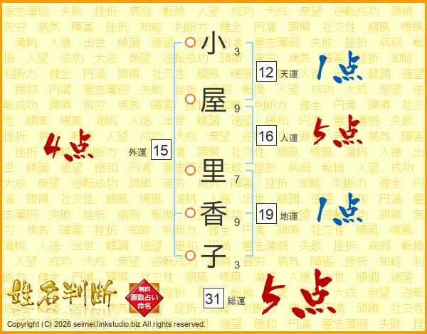 小(3画)屋(9画) 里(7画)香(9画)子(3画)