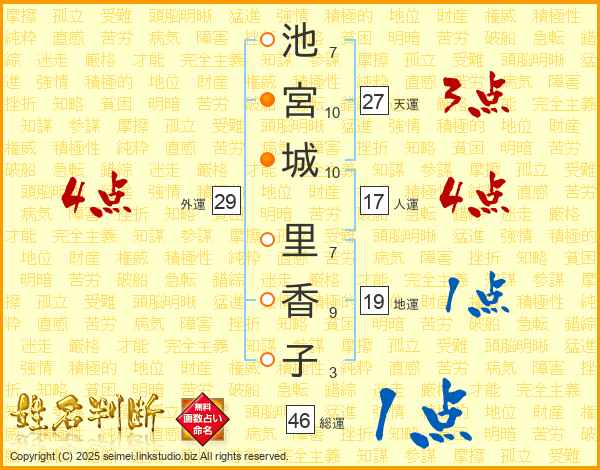 池(7画)宮(10画)城(10画) 里(7画)香(9画)子(3画)