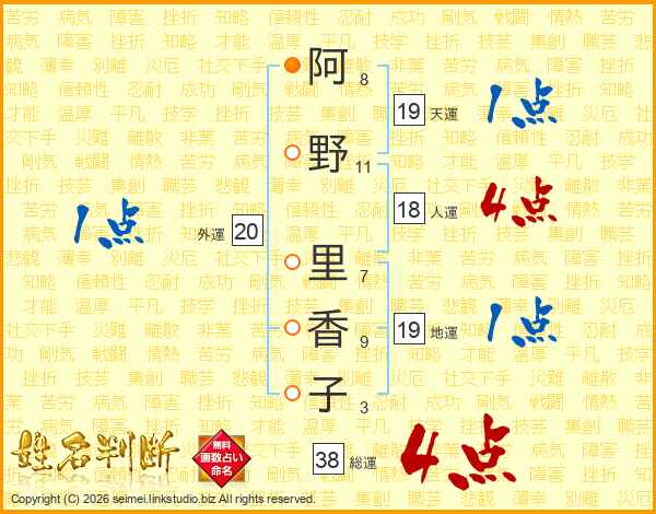 阿(8画)野(11画) 里(7画)香(9画)子(3画)