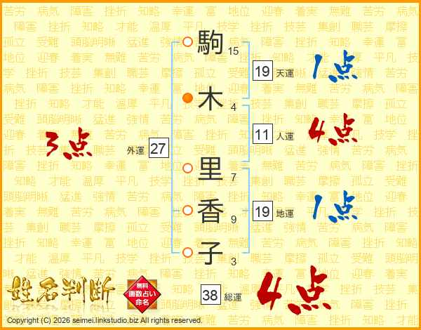 駒(15画)木(4画) 里(7画)香(9画)子(3画)