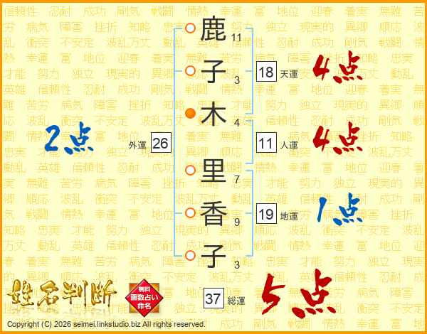 鹿(11画)子(3画)木(4画) 里(7画)香(9画)子(3画)