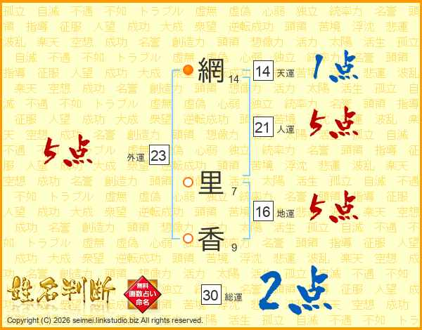 生活面を象徴する運勢です。外部から受ける影響力を表し、結婚運、家庭運や職場、環境への順応性を表します。総運から人運を引いた画数。姓や名が1文字の場合を除く。
