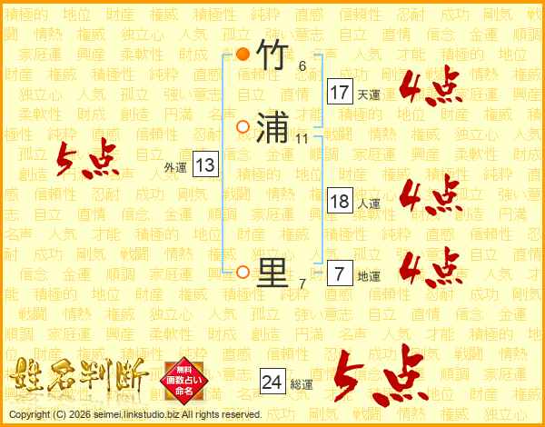 生活面を象徴する運勢です。外部から受ける影響力を表し、結婚運、家庭運や職場、環境への順応性を表します。総運から人運を引いた画数。姓や名が1文字の場合を除く。