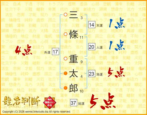 三(3画)條(11画) 重(9画)太(4画)郎(10画)