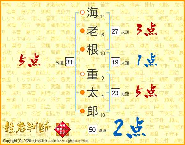 海(11画)老(6画)根(10画) 重(9画)太(4画)郎(10画)