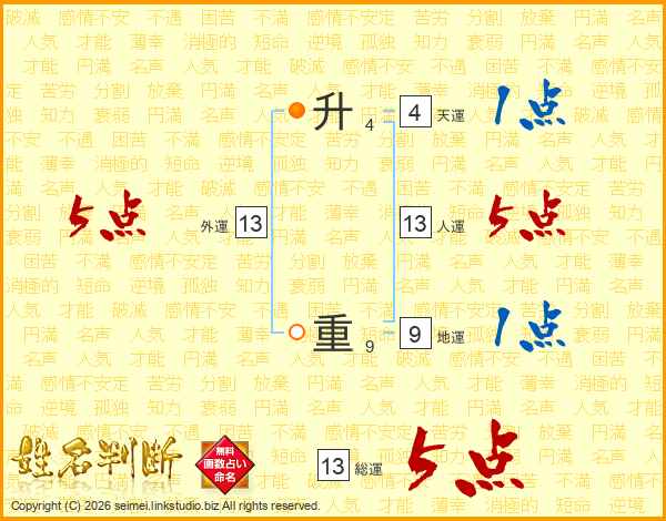 生活面を象徴する運勢です。外部から受ける影響力を表し、結婚運、家庭運や職場、環境への順応性を表します。総運から人運を引いた画数。姓や名が1文字の場合を除く。